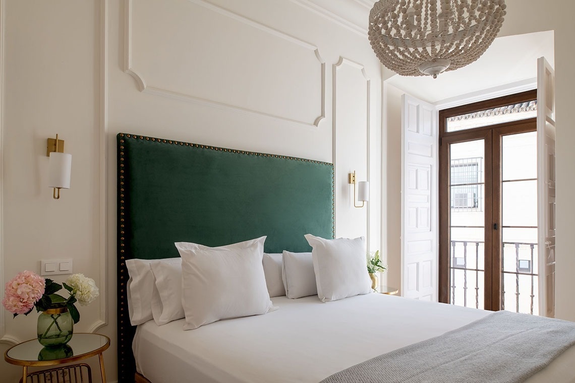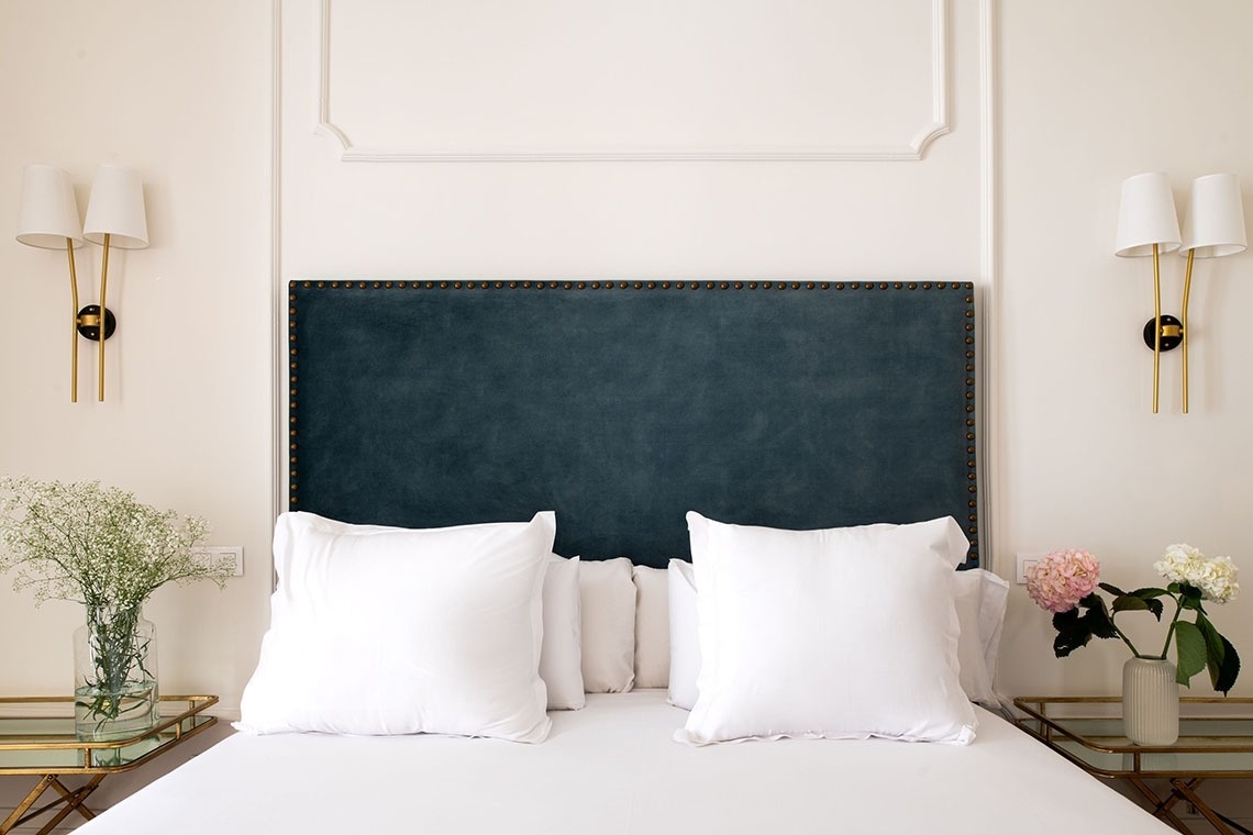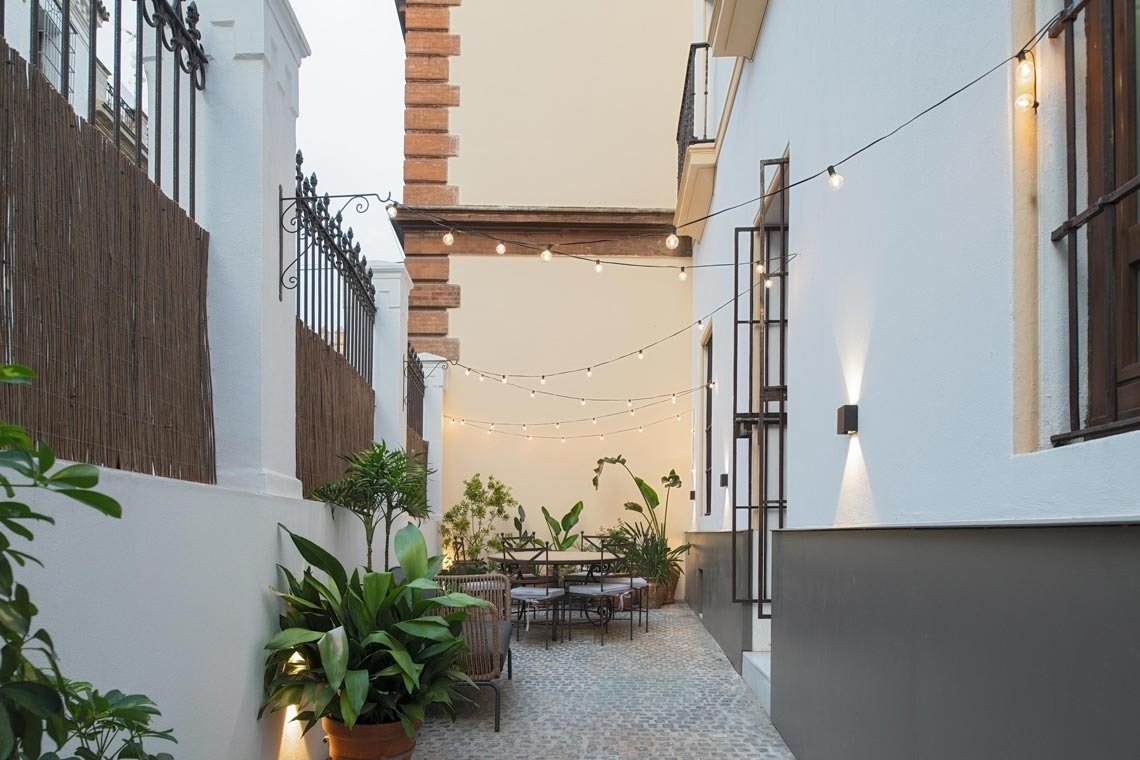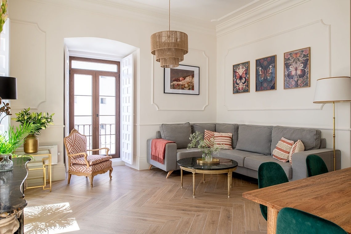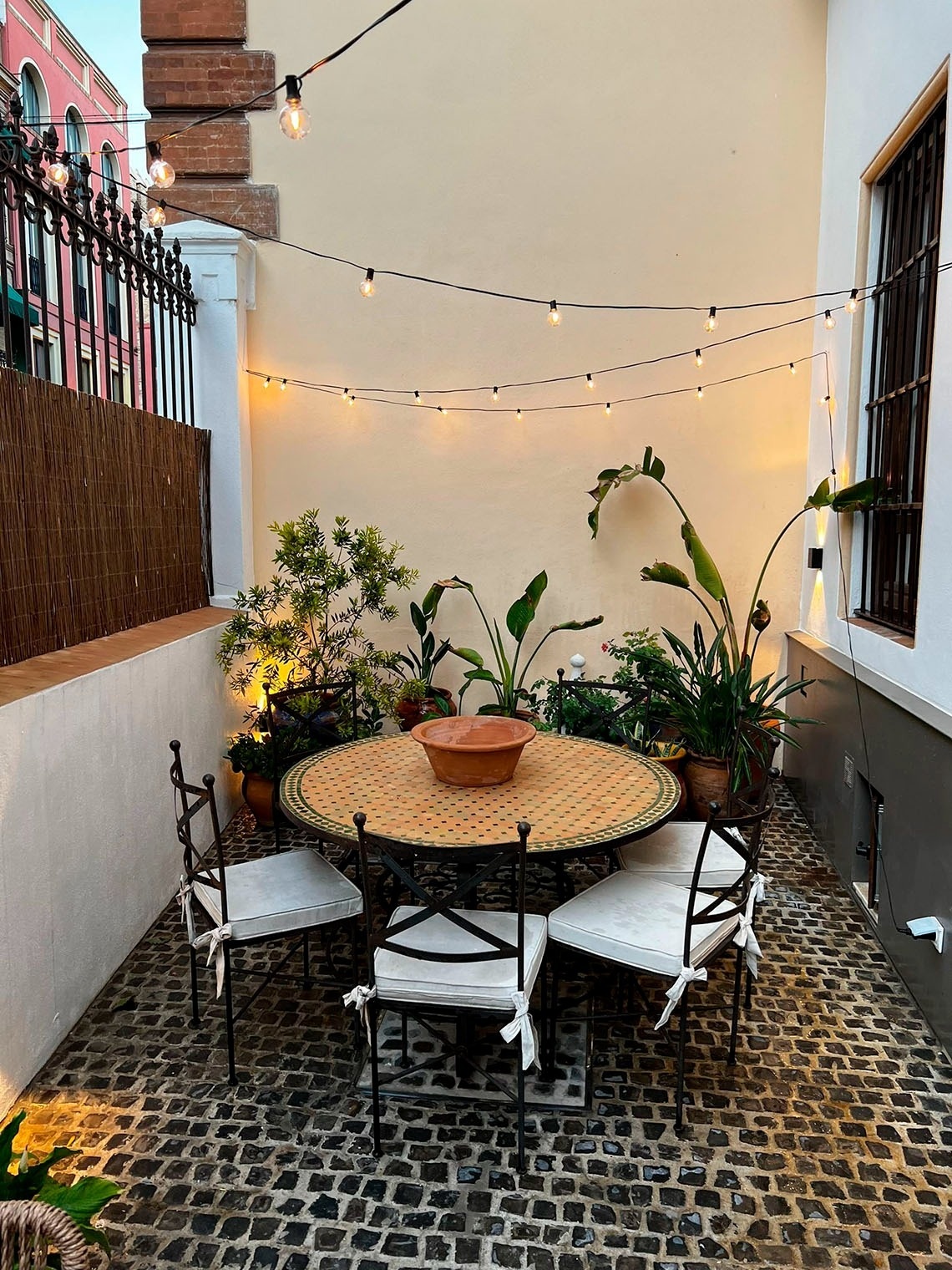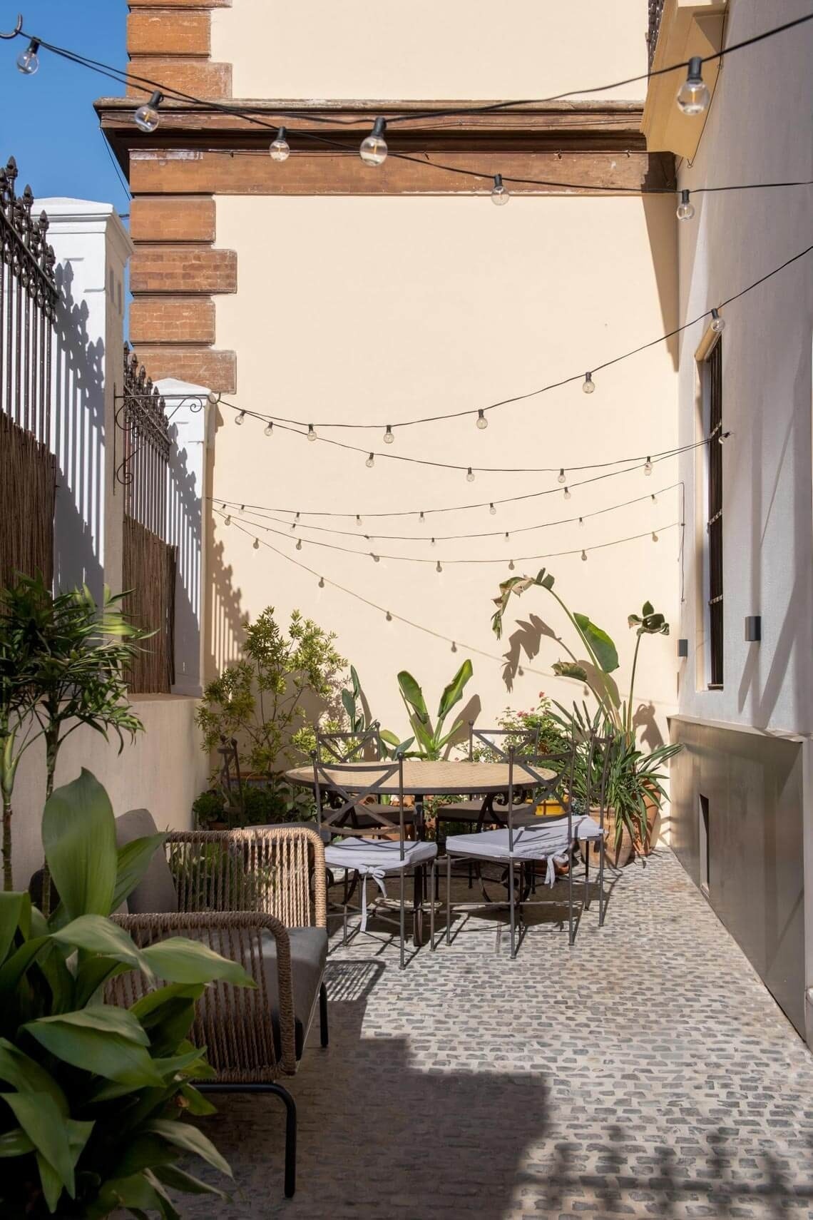 Our 80m2 Apartment with Private Patio, located on the ground floor, consists of a spacious living-dining room that elegantly merges with the kitchen, creating a modern and welcoming atmosphere that will make you feel right at home. From here, you have direct access to a 35m2 private patio, equipped with a shower to cool off on the hottest days, sun loungers and a charming table for two, ideal for enjoying a meal or breakfast outdoors.